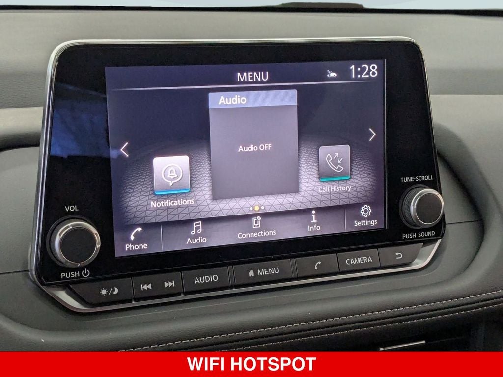 - Radio: AM/FM NissanConnect -inc: 6 speakers plus 2 tweeters, Apple CarPlay, Android Auto, 8" color touch screen display, Bluetooth®, 2 front USB type-C, Wi-Fi hotspot and NissanConnect Services powered by SiriusXM