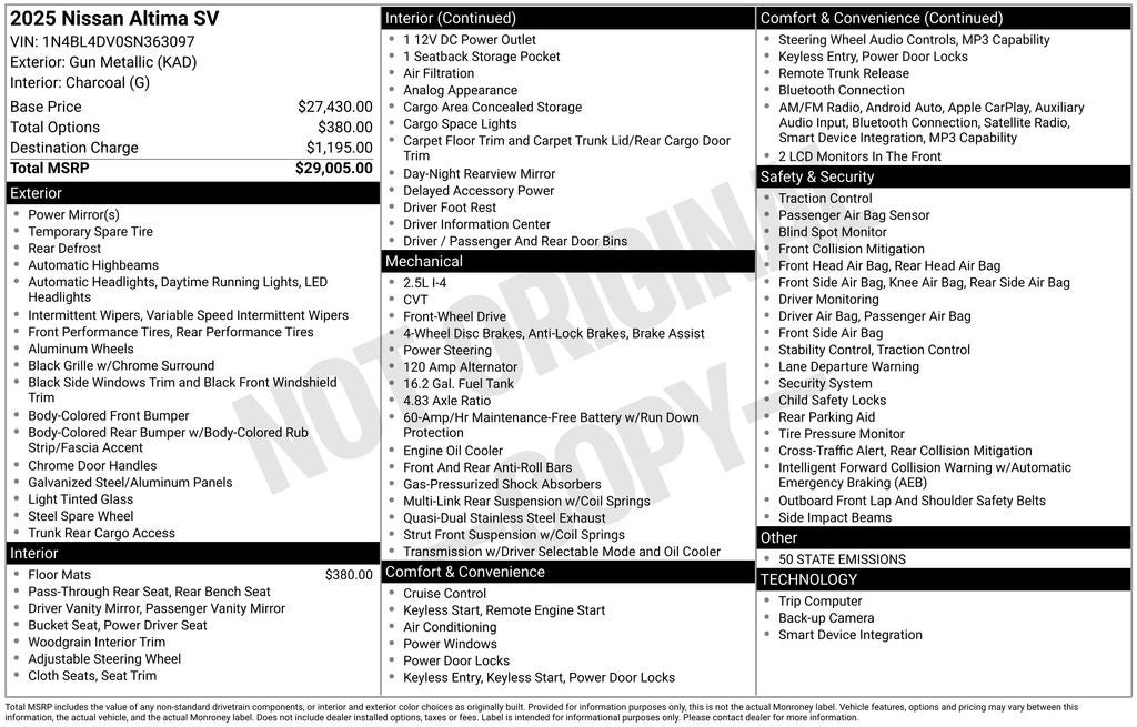 2025 Nissan Altima 2.5 SV 4D Sedan Gun Metallic 2.5 SV 2.5L 4-Cylinder DOHC 16V CVT with Xtronic FWD